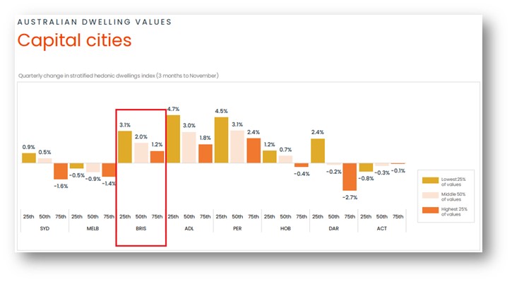 Brisbane’s lower quartile has experienced the strongest growth, driven by first-home buyers and investors seeking affordability.
